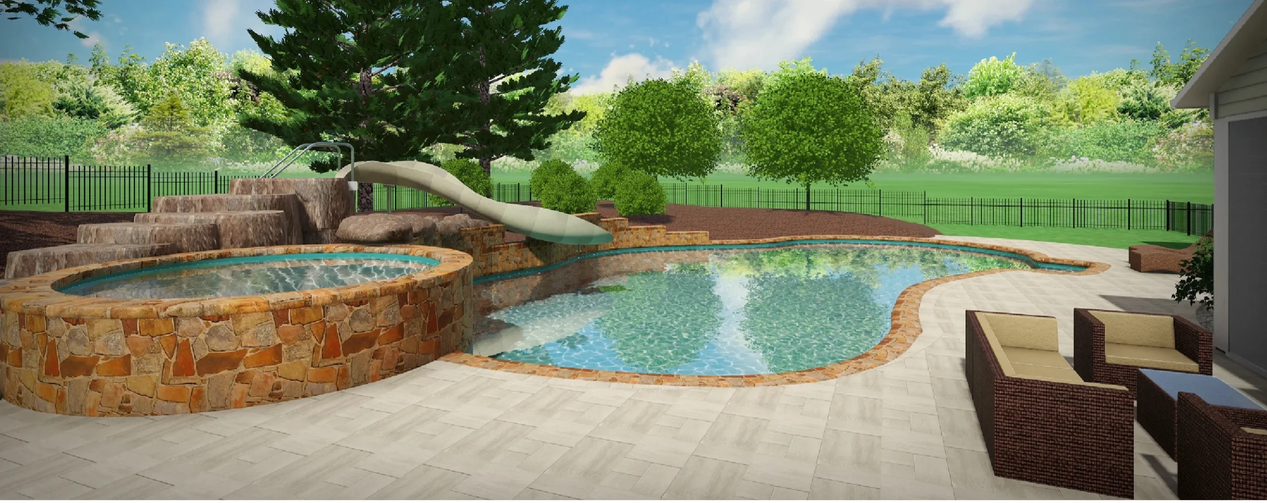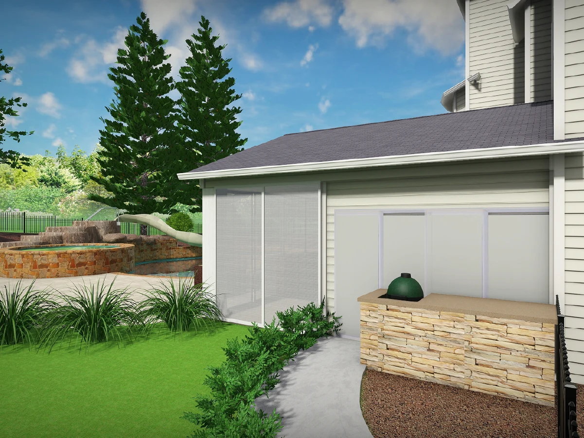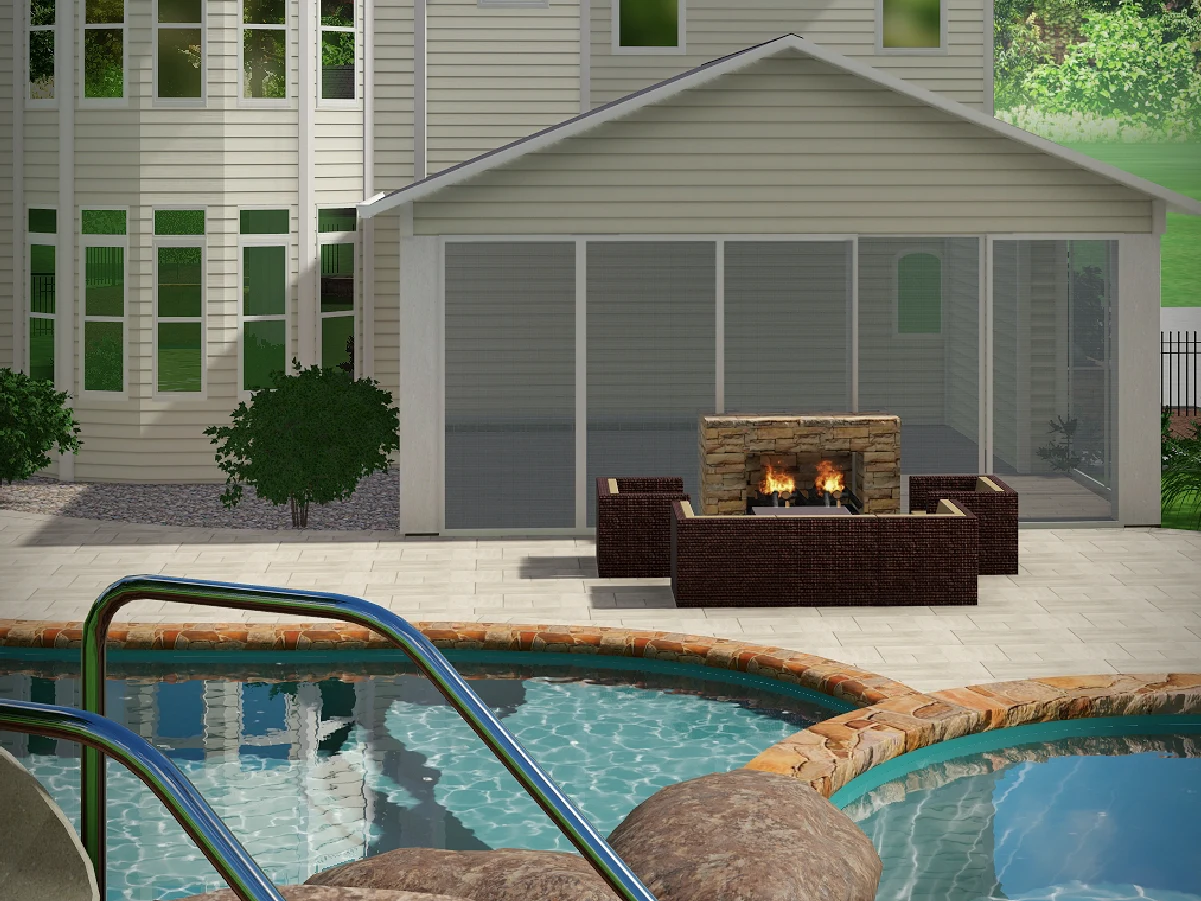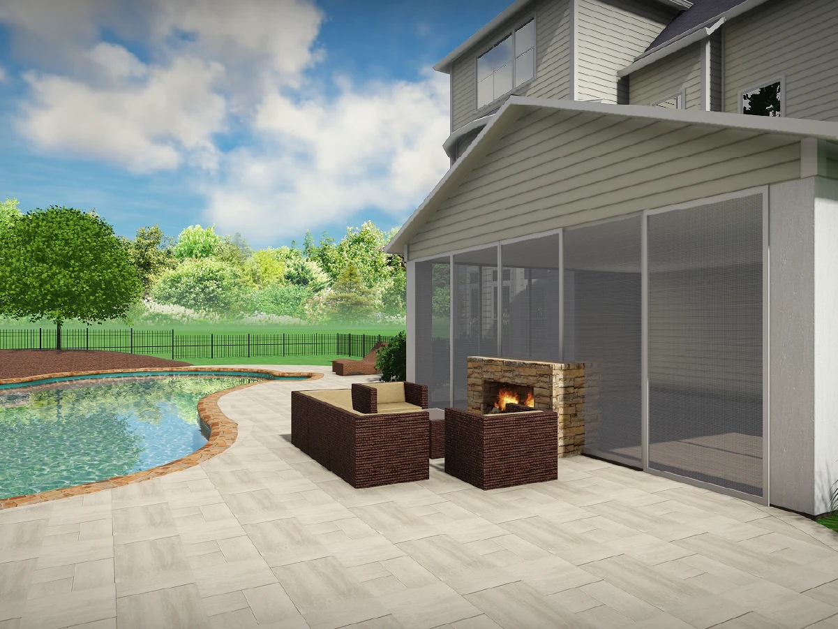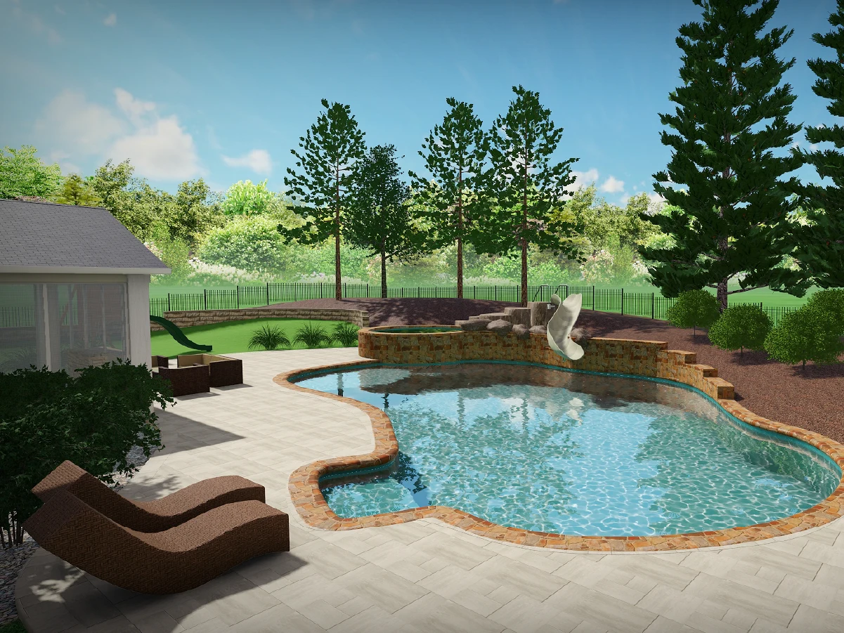 3D visualizations that seamlessly integrate high-end hardscaping with family-friendly entertainment features