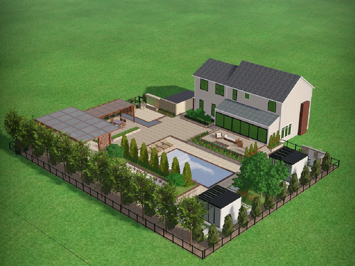 Show clients how a pool, kitchen, fire pit, and playground can coexist in a single, high-end aesthetic.